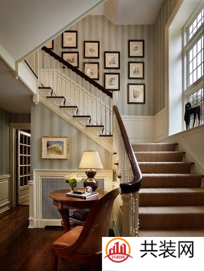 这个楼梯的设计有些许的美式风格,稳重中又见雅致。浅色的竖条纹壁纸显得十分雅致,紧贴墙面的楼梯形成利落的L型,台阶侧面的雕刻放大了细节之处的美感。