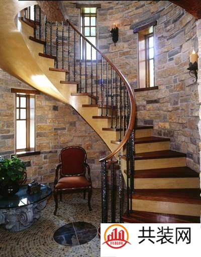 优雅的圆形空间,大大小小的砖石砌成的墙面好像年代久远的古堡,木质楼梯旋转而上,形成一道优美的弧线。